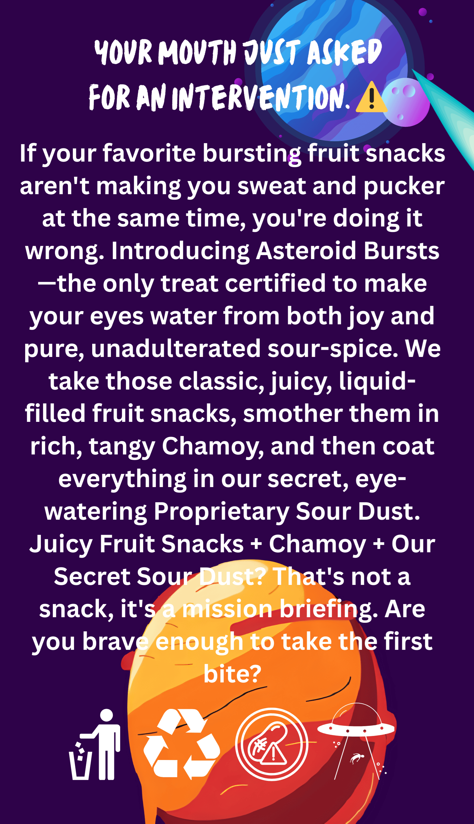 Forget what you've seen in the movies. The cosmic event of the century didn't arrive with a bang, but with a burst. We've intercepted a delicious meteor shower, and we're calling them Asteroid Bursts. These are not your typical space rocks. Each asteroid is a chewy, mysterious orb coated in a shimmering sauce that tastes like it was scooped from a sweet and sticky nebula. After their long journey through the flavor-verse, they've collected a unique cosmic dust—a sour, lime-infused powder crackling with the authentic spices of a distant Latin-American galaxy.