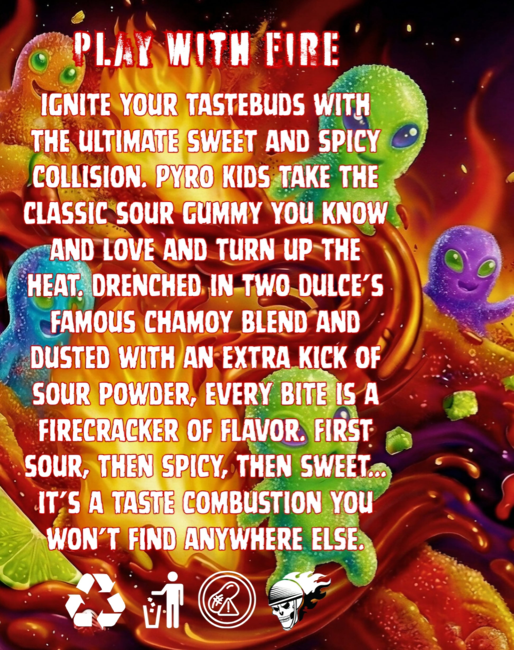Pyro Kids take the classic sour gummy you know and love and turn the volume all the way up to eleven. We don't just sell candy; we orchestrate a flavor riot. First, it hits you with that nostalgic sour punch, then the complex spices kick in, and finally, it settles into a sweet, chewy bliss. It’s a three-stage taste combustion you won’t find anywhere else.